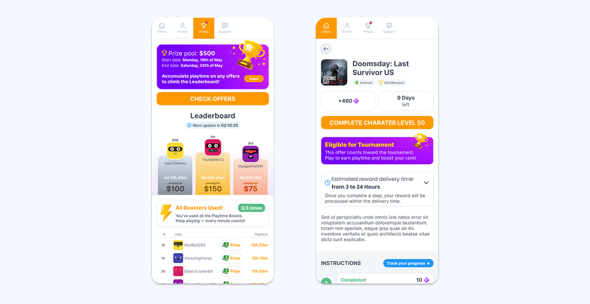 Players can track their ranking and potential winnings in real time, with prize pools reaching thousands of dollars. Tournaments drive longer play sessions, higher engagement, and increased offerwall activity across participating apps.