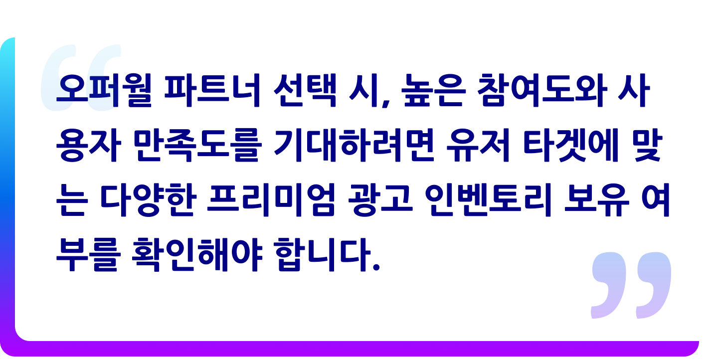 오퍼월 파트너 선택 시, 높은 참여도와 사용자 만족도를 기대하려면 사용자 타겟에 맞는 다양한 프리미엄 광고 인벤토리를 보유하고 있는지 확인하는 것이 중요합니다. 그 외에도 투명성, 명확한 커뮤니케이션, 공정한 페이아웃, 신뢰할 수 있는 핵심은 광고 수익 잠재력을 극대화할 뿐만 아니라 사용자와 긍정적인 관계를 형성하여 장기적인 참여와 충성도를 이끌어내는 파트너를 찾는 것입니다.