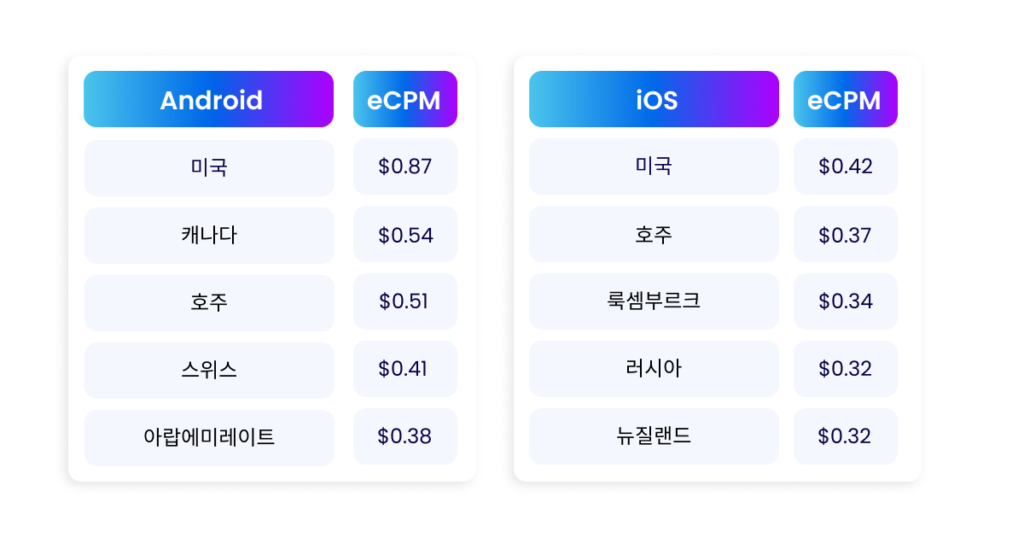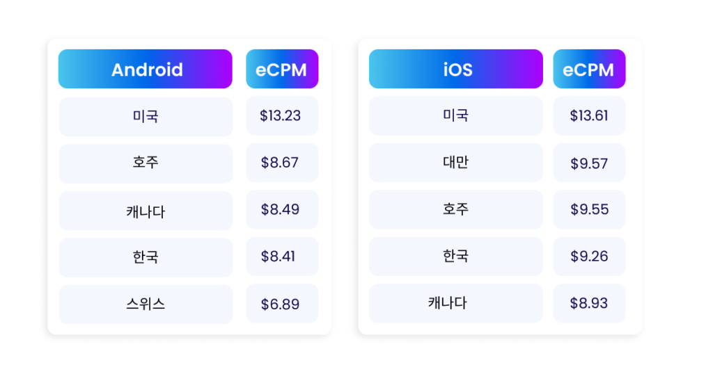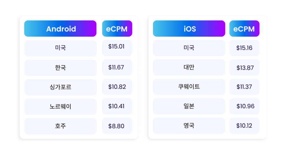 과거에는 동일한 국가에서 똑같은 광고를 게재해도, iOS 사용자가 안드로이드 사용자보다 훨씬 높은 eCPM을 기록했습니다. 그러나 Apple이 ATT 를 출시하고 IDFA를 더 이상 사용하지 않게 된 이후로는 개인정보 보호 정책의 변화로 인해 iOS에서 가치 있는 사용자를 타겟팅하기가 어려워졌습니다. 따라서, 지금은 OS가 다르더라도 eCPM은 큰 차이가 없습니다.