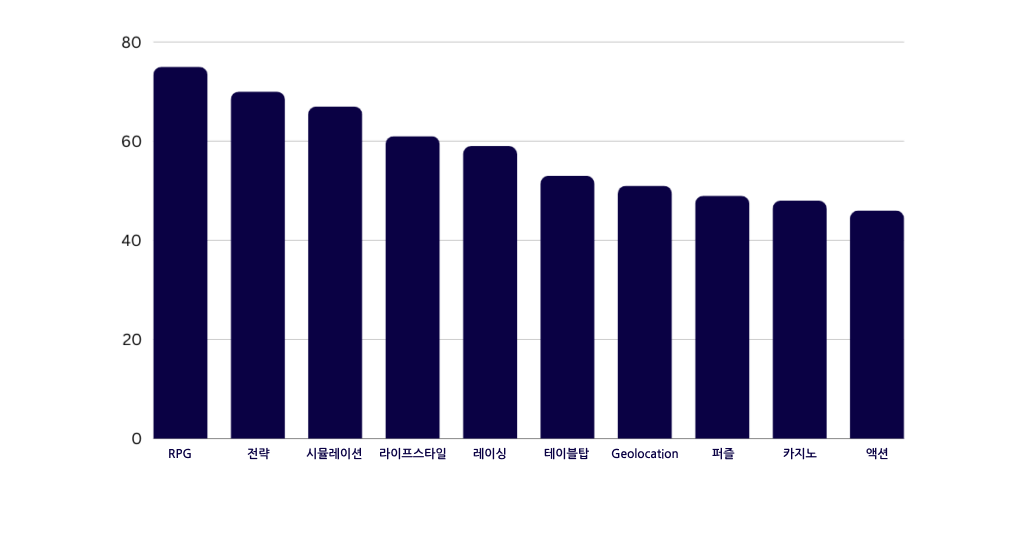 미스트플레이의 충성도 지수에 따르면, 충성도가 가장 높은 모바일 게임 장르는 다음과 같습니다(1~100점 척도):
